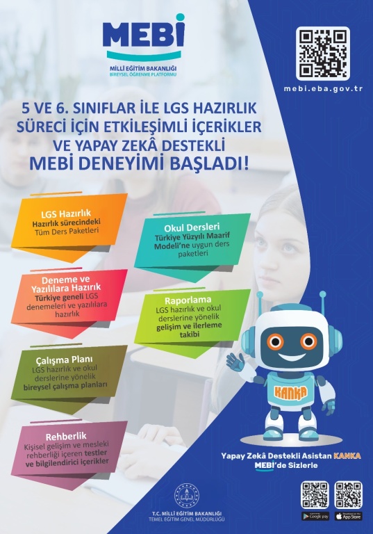 8’inci sınıf öğrencilerimizin LGS hazırlık sürecini destekleyen; yeni müfredatın uygulandığı 5 ve 6’ncı sınıf düzeylerindeki öğrencilerimizi akademik anlamda güçlendiren MEBİ, sunduğu dijital kaynaklar ve interaktif materyaller ile ortaokul düzeyinde öğrenim gören öğrencilerimizin derslerini pekiştirmelerine, konu tekrarlarını istedikleri zaman yapabilmelerine ve öğrenme sürecine aktif katılımlarına imkân tanıyor.