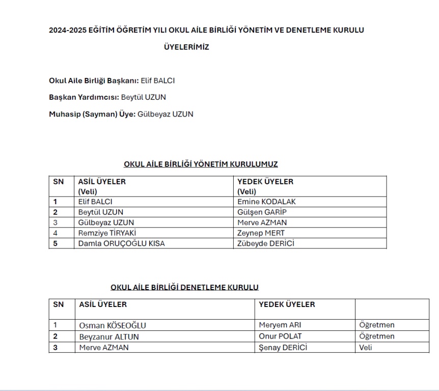 • Okul Aile Birliği Yönetim ve Denetleme Kurulumuz